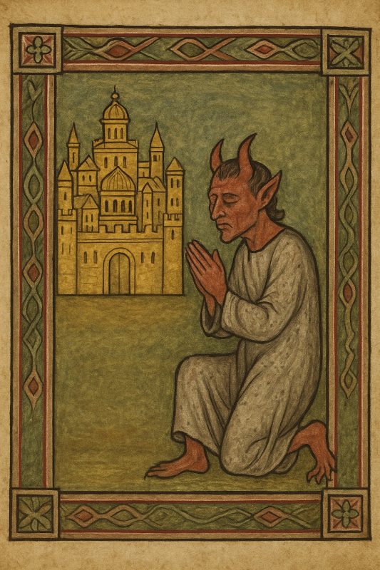In this vision, even the image of the devil is transformed: no longer ruler of the abyss, but a fallen spirit in remembrance, touched by mercy, kneeling before the gates of light.