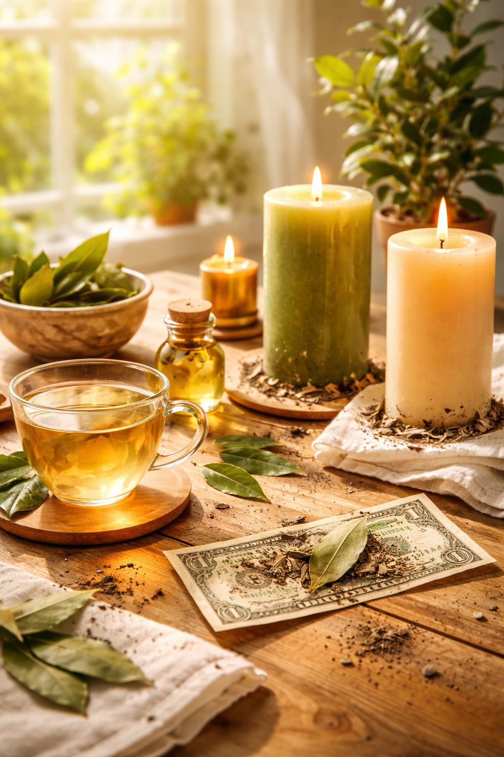 Write a realistic, grounded intention related to money—such as clarity, discipline, or opportunity—on a bay leaf. Burn it fully.