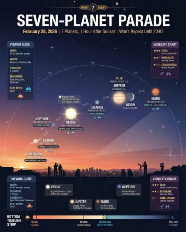 Seven planetary bodies will appear along one arc of the evening horizon — not in perfect symmetry, not in theatrical precision, but in a visible harmony that invites attention.