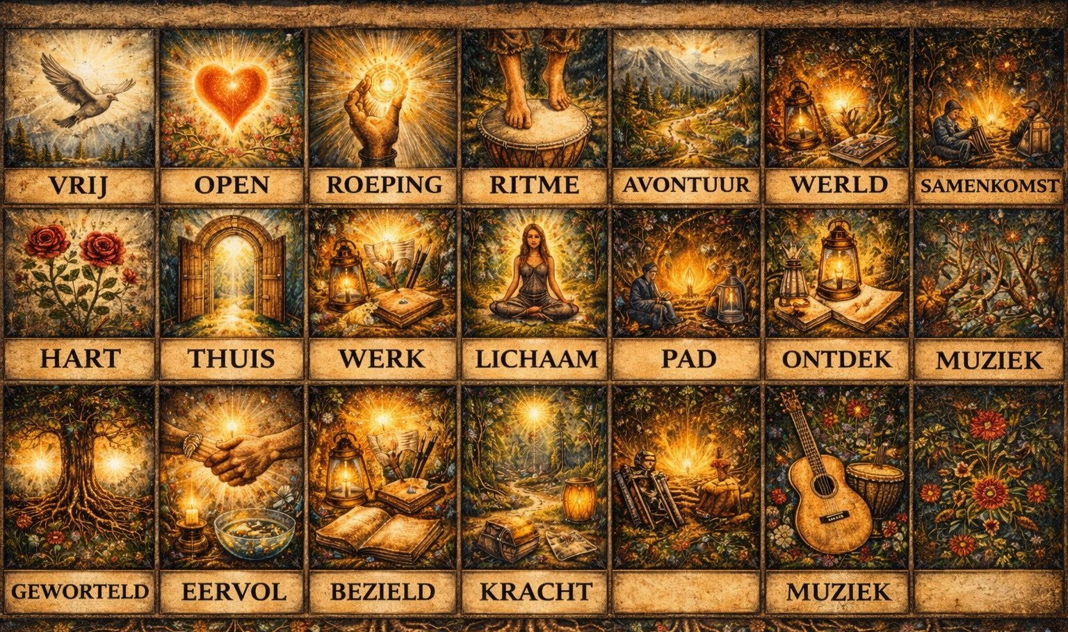 (VRIJ, OPEN, ROEPING, AVONTUUR, WERELD, SAMENKOMST…).